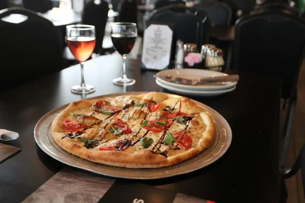 fresh garlic and extra virgin olive oil, special seasonings, fresh mozzarella, tomato, and fresh basil topped with Parmesan and a balsamic glaze