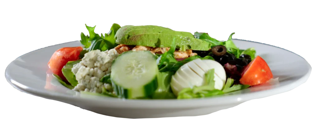 spring mix topped with grilled chicken breast, boiled egg, red onions, bacon bits, black olives, sliced avocado, cucumbers, tomatoes, & crumbled bleu cheese