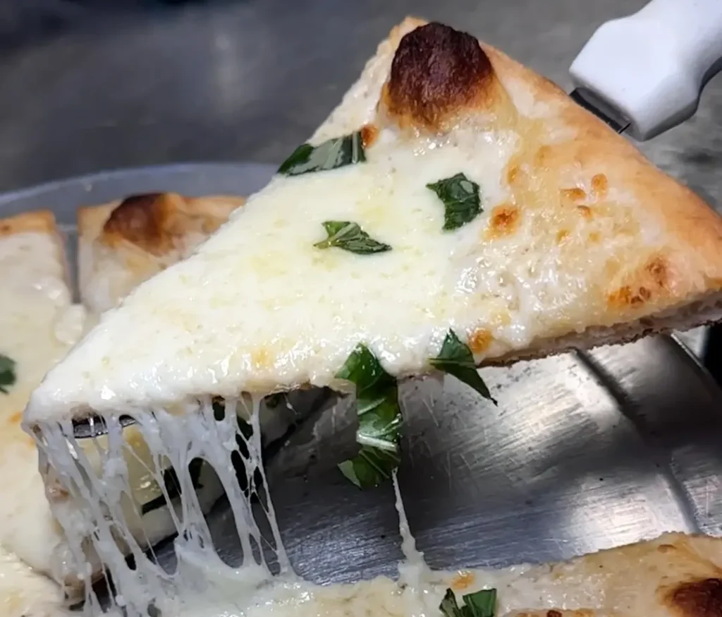 white pizza with a roasted garlic white sauce, mozzarella, provolone, Parmesan, and fresh basil