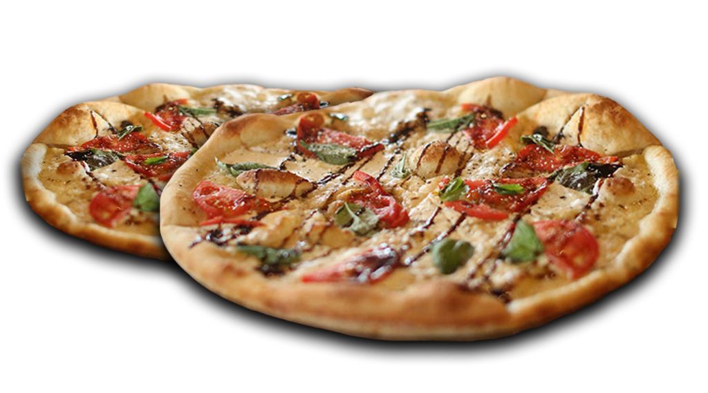pizza sauce, special seasonings, fresh mozzarella, fresh garlic, drizzled extra virgin olive oil, and topped with fresh basil